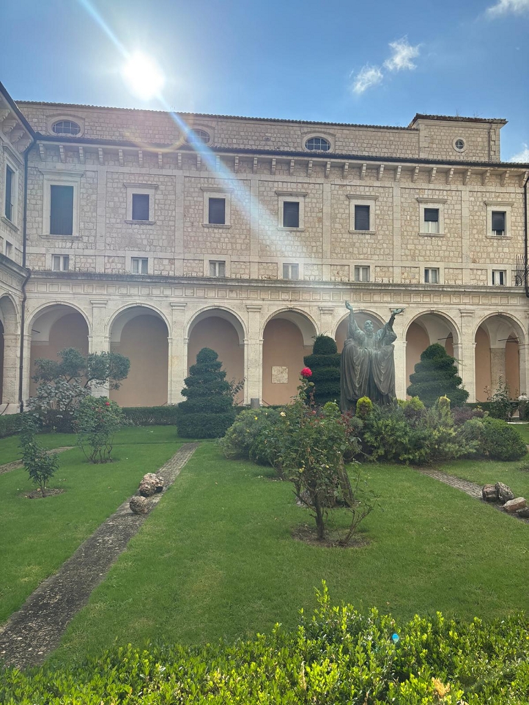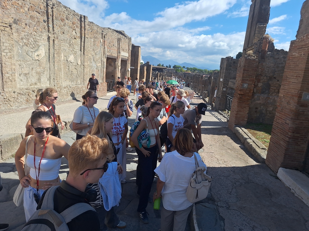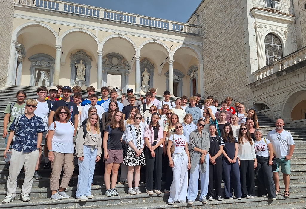 Ein Tagesausflug nach Pompeji (Nähe Neapel) lieferte eindrucksvolle Bilder einer römischen Provinzstadt, die durch den Vesuvausbruch (79 n.Chr.) großteils verschüttet, jetzt teilweise ausgegraben, einen wunderbaren Blick in das antike Alltagsleben bietet, eine Vorstellung von dem gibt, wie alltägliche Abläufe in allen Lebensbereichen stattgefunden haben. Auf der Rückfahrt nach Rom war es für die Maturant:innen eine Herzensangelegenheit, dem Mutterkloster aller Benediktinerklöster, Monte Cassino, einen Besuch abzustatten.