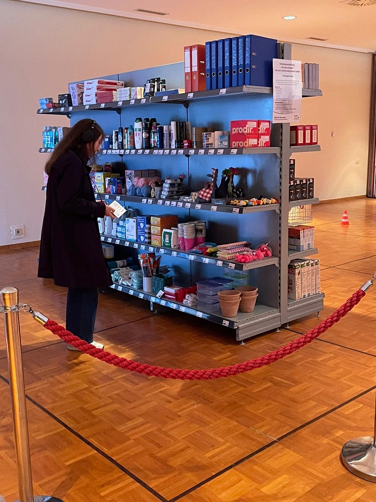 Als nächstes kam der Schizophrenie-Einkauf. Die Schüler:innen mussten probieren, eine Einkaufsliste in einem kleinen, nachgestellten Geschäft abzuarbeiten. Ablenken sollten dabei wieder über Kopfhörer abgespielte negative Gedanken, die typisch für jene Erkrankung sind.