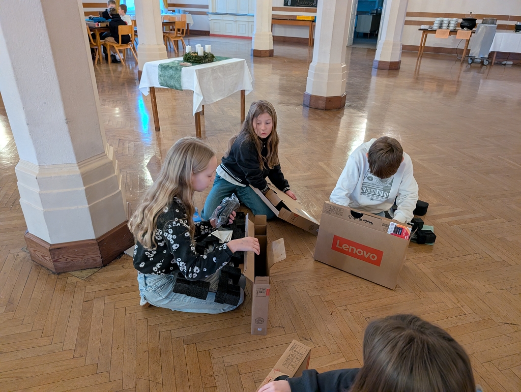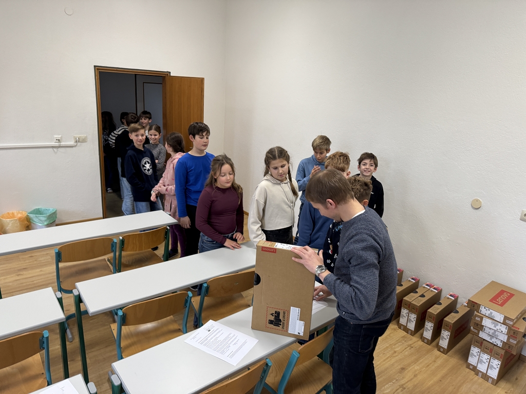 In diesem Schuljahr ging es sich gerade noch rechtzeitig vor den Weihnachtsferien aus. Die Professoren Bürger, König und Wernig konnten den Schüler:innen dabei gleich einen praktischen Einblick in die Arbeitswelt von IT-Administrator:innen geben. Bei der Ausgabe wurden die Seriennummern kontrolliert, die Übernahme protokolliert und anschließend das Paket von den Schüler:innen auf Vollständigkeit überprüft.