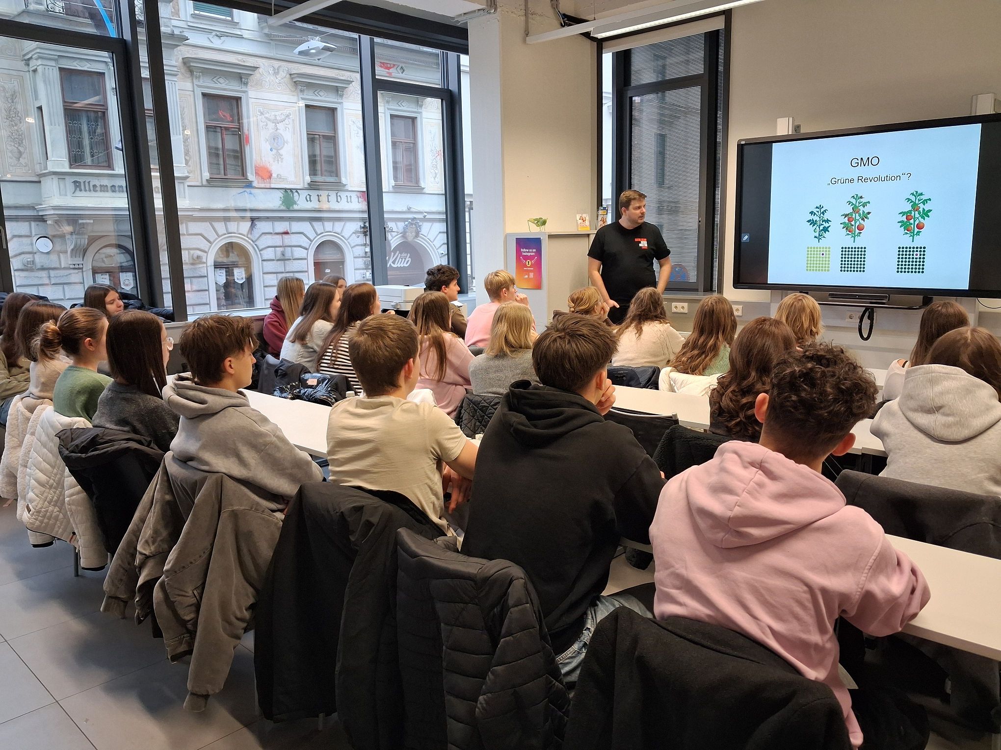 Unser Hauptziel war das Labor der Universität Graz. Zu Beginn nahmen wir an einem Vortrag über genetische Veränderungen teil. Dabei wurde erklärt, was DNA ist und, wie genetische Veränderungen entstehen können. Als anschauliches Beispiel diente eine Tomate, anhand der gezeigt wurde, wie bestimmte Eigenschaften gezielt verändert werden können und, wie man genetisch veränderte Organismen nachweist.