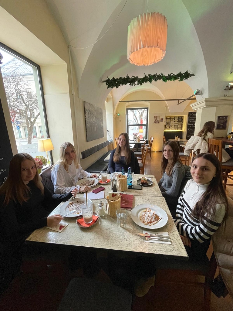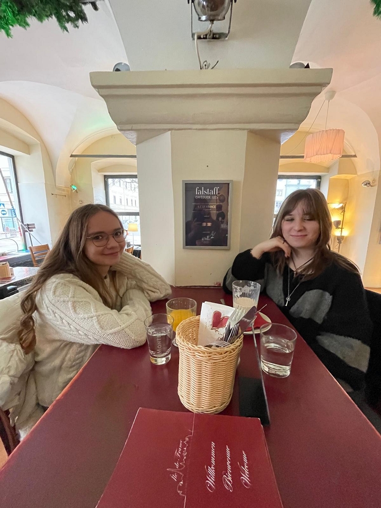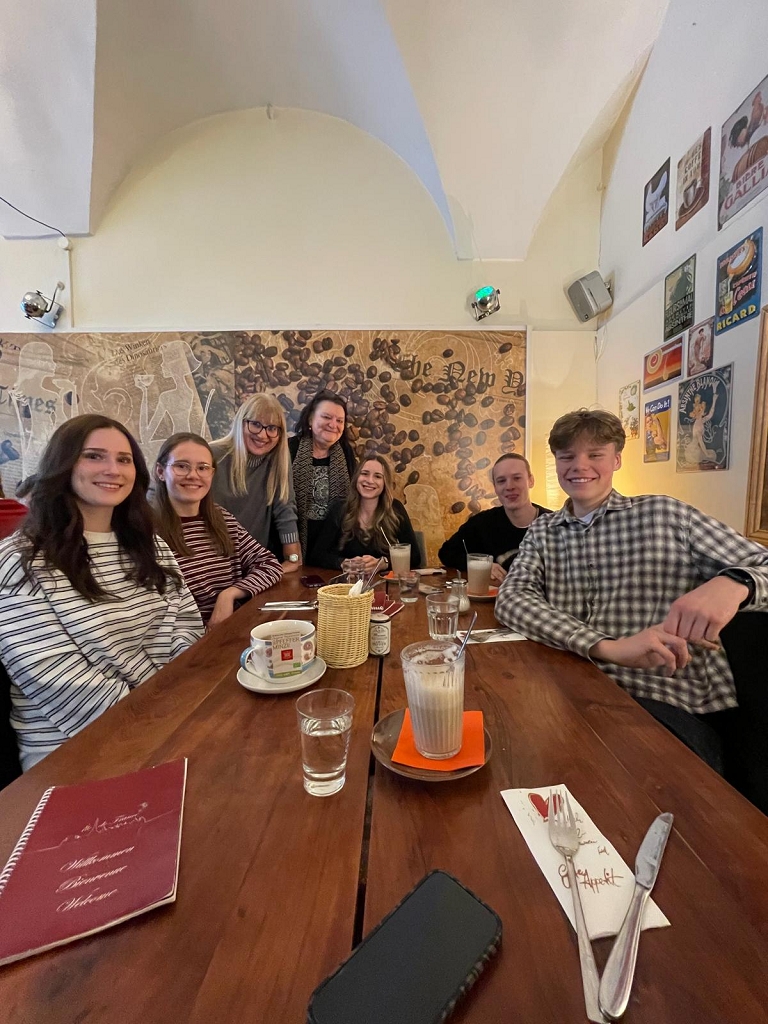 À Klagenfurt, notre assistant de langue, Lucas Roger, s’est joint au groupe, ajoutant une touche encore plus française à l’aventure. La journée a débuté dans une atmosphère chaleureuse autour d’un savoureux petit‑déjeuner au bistrot « Île de France », parfait pour se mettre dans l’ambiance.