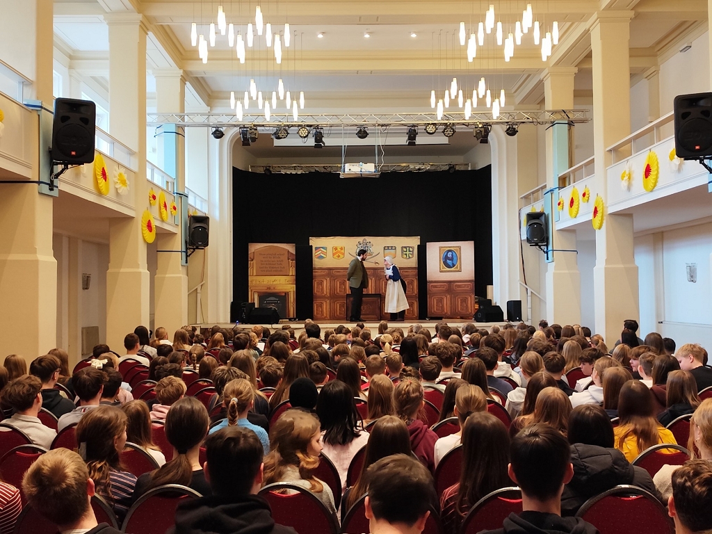 Für die rund 200 Schülerinnen und Schüler der Oberstufe wurde eine gekürzte, aber eindrucksvolle Fassung von Hamlet aufgeführt. Das berühmte Drama von William Shakespeare wurde adaptiert und überzeugte durch lebendige Darstellung, sprachliche Klarheit und große Dramatik.