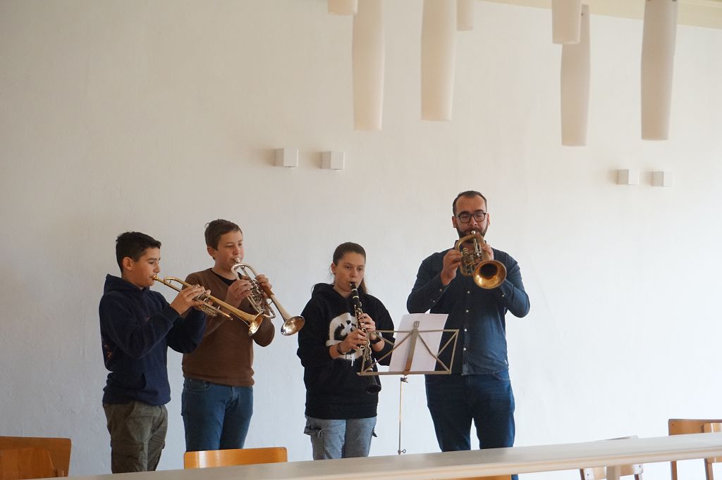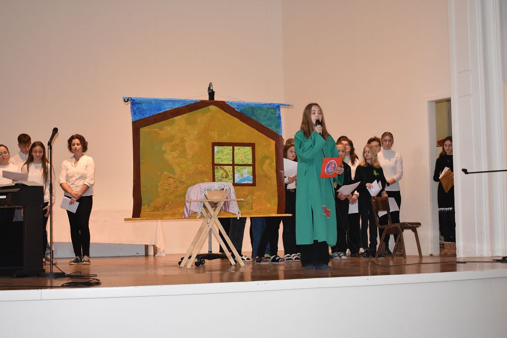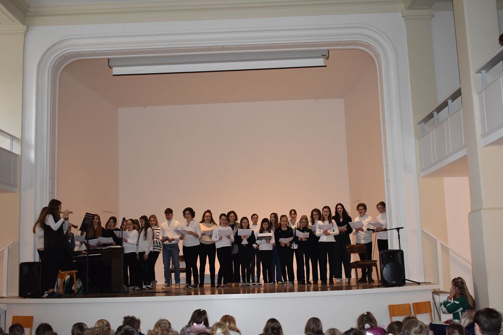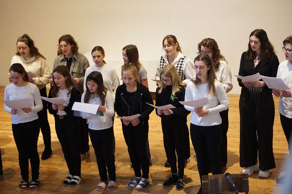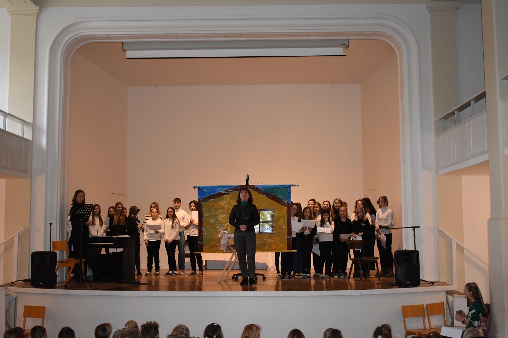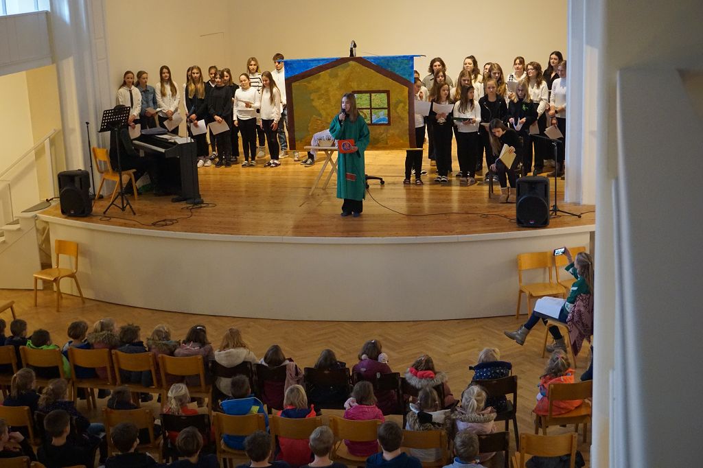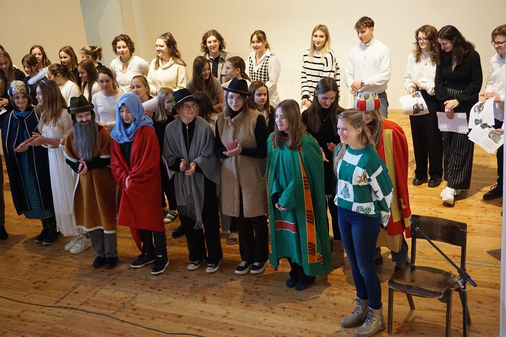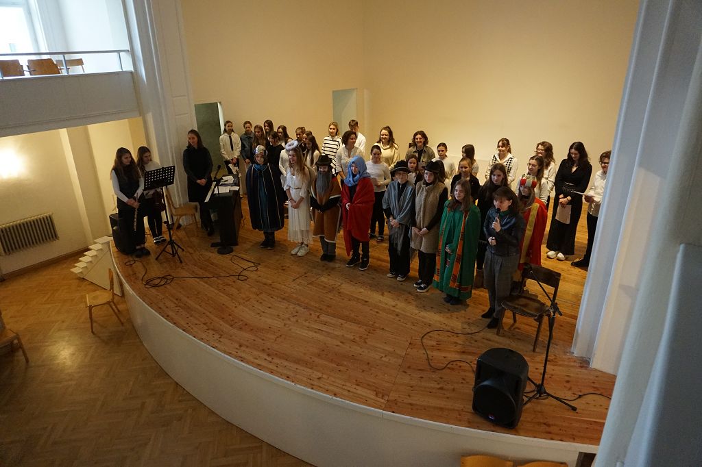 Die zweite Aufführung fand dann einen Tag später, am 22. Dezember 2022, im Rahmen des Weihnachtsgottesdienstes vor der gesamten Schulgemeinschaft in der Stiftskirche statt. Die gesangliche Umrahmung erfolgte durch den Schulchor unter Leitung von Prof. Almut Wakounig-Dalton und instrumental durch ein Bläser-Ensemble geleitet von Prof. Thomas Zdravja.