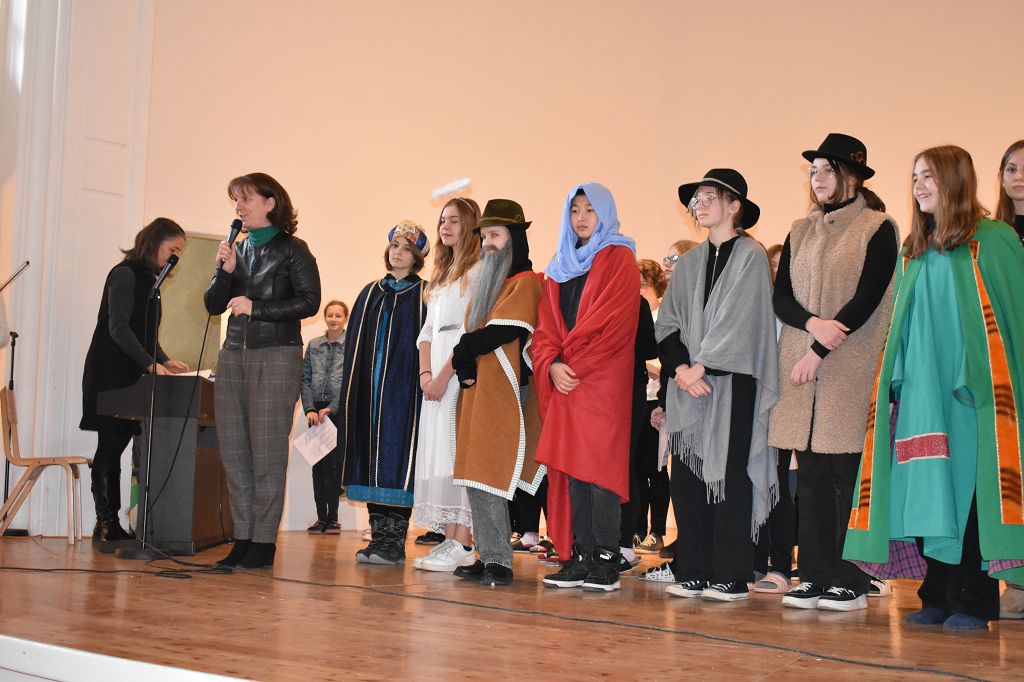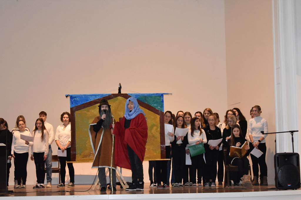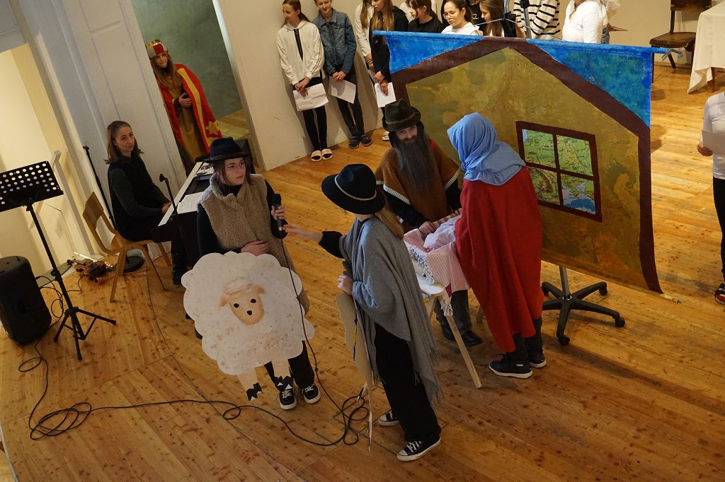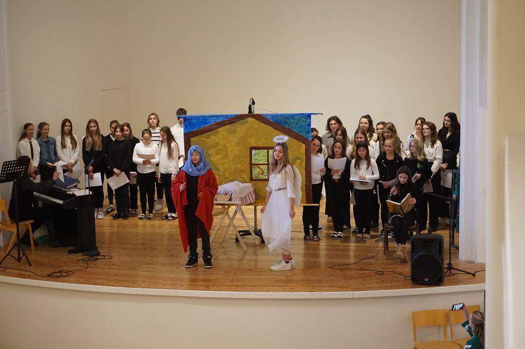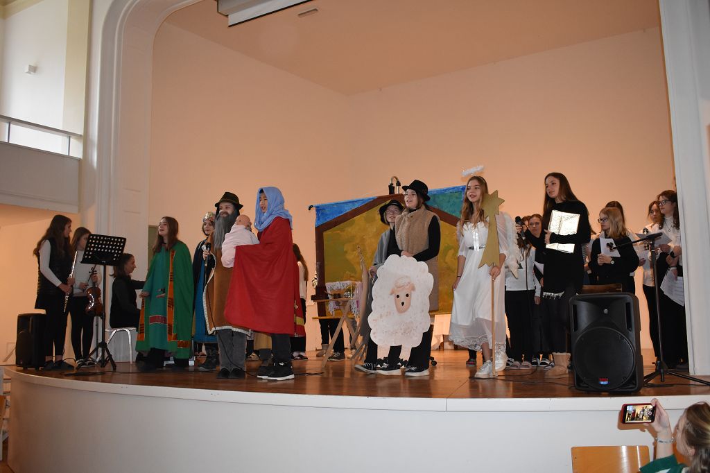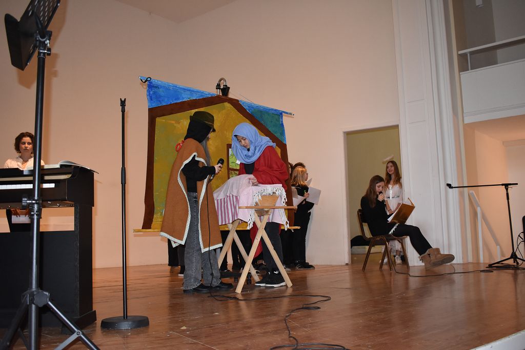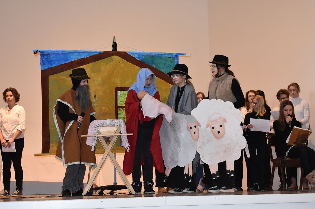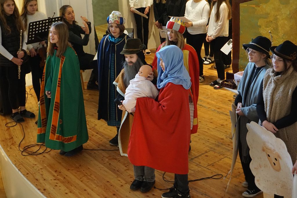 Unter der Leitung und Regie von Prof. Victoria Meklin gestalten Nora Theiss und Benjamin Berchtold aus der 4D, Anna Jelen-Höberl aus der 3D, Amelie Mayerhofer, Emma Vastag, Sophie Lipovsek und Larissa Paulitsch aus der 3C, Alisha Zapp aus der 3B und Anna Rafling aus der 2D das Schauspiel. Dabei spielte Nora den Josef, Benjamin die Maria, Anna J. den Engel, Amelie einen Hirten, Emma den zweiten Hirten, Sophie, Alisha und Anna R. stellten jeweils einen der drei Weisen aus dem Morgenland dar. Larissa verbalisierte als Erzählerin die Rahmenhandlung des Krippenspiels.