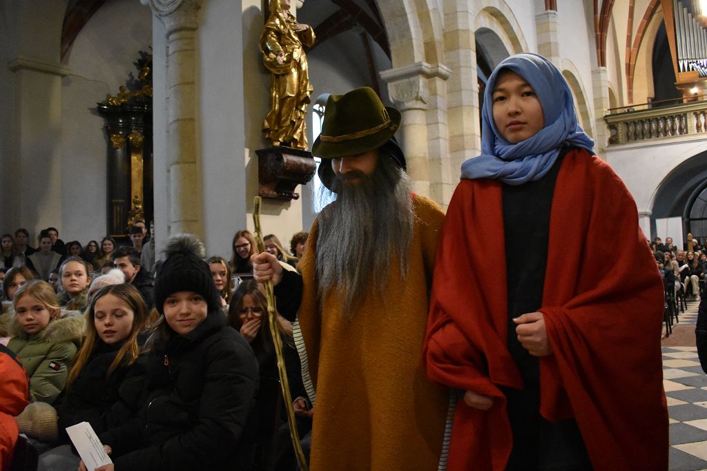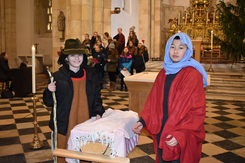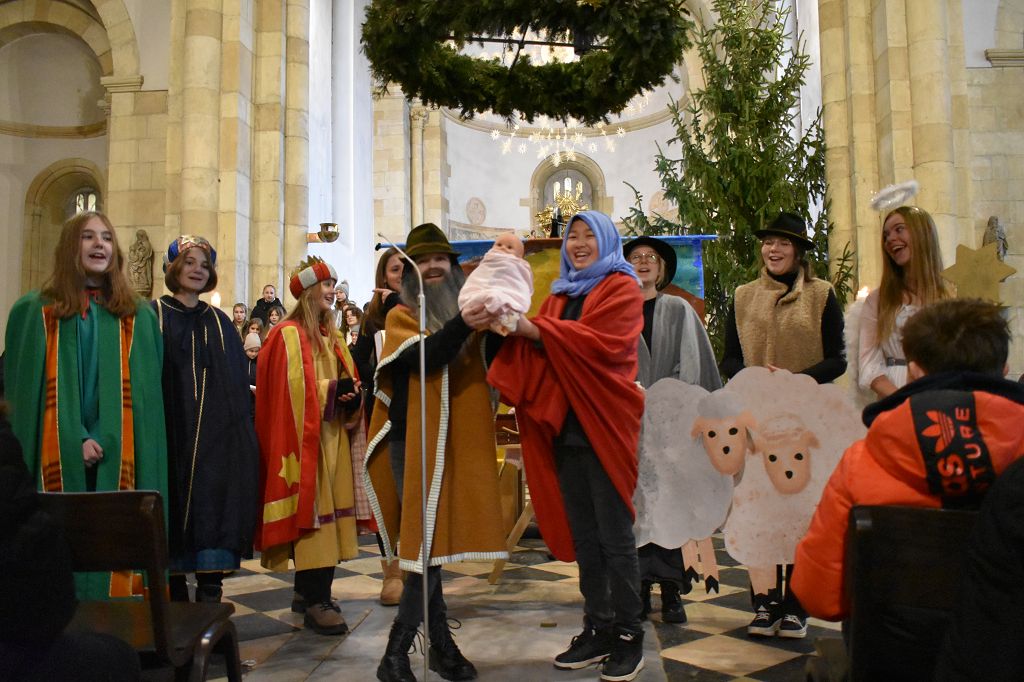 Der Schulchor unter der Leitung von Professorin Almut Wakonig-Dalton begleitete uns durch die Feier von Wort und Eucharistie und Professorin Victoria Meklin hatte, dem Evangelium folgend, mit den Schülerinnen und Schülern der Unterstufe ein Krippenspiel einstudiert, welches das Wort des Evangeliums mit großer Freude zum Leben erweckte.