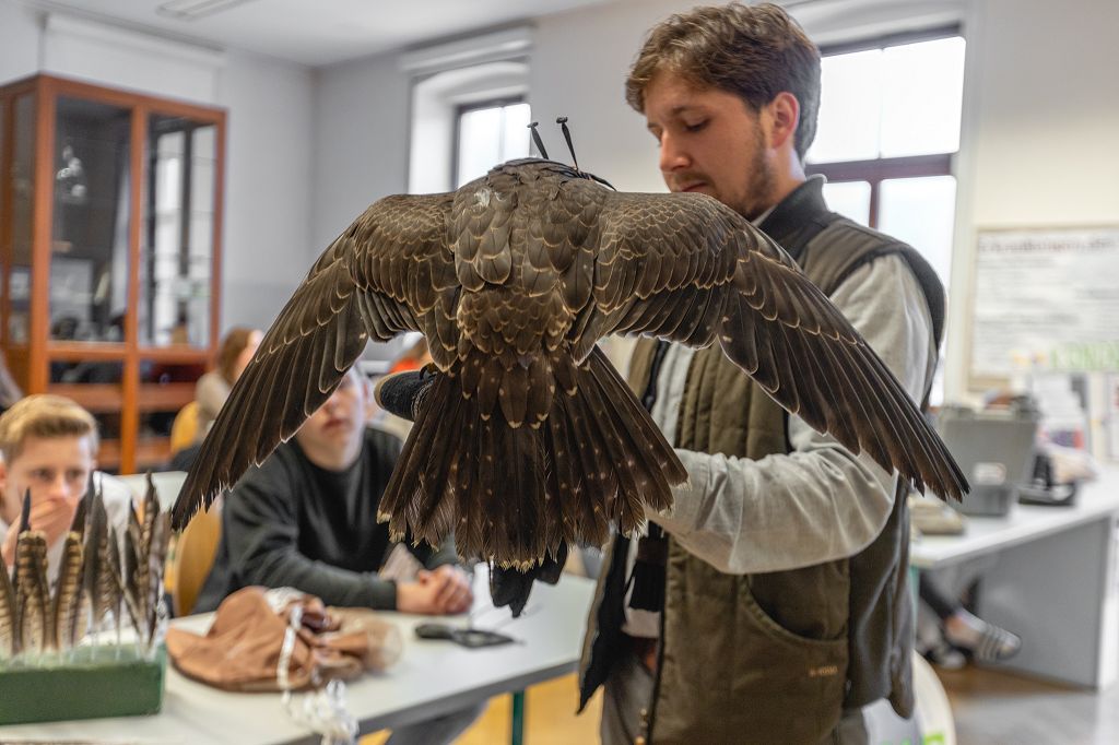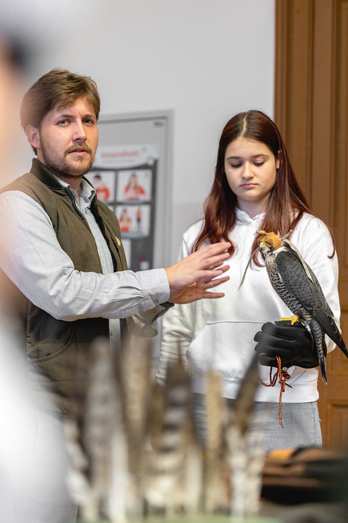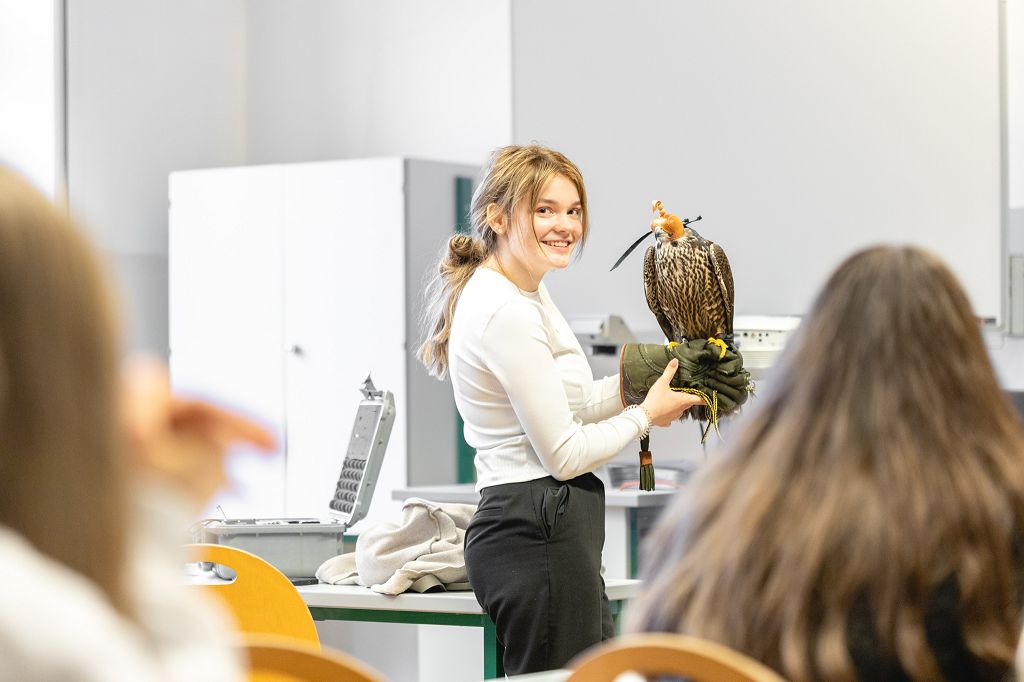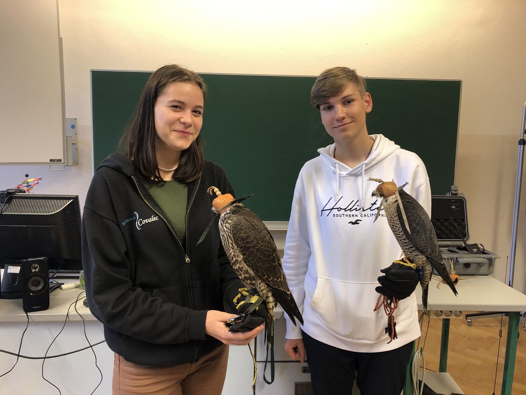 Mit zwei Wanderfalken und einer beachtlichen Menge an Zubehör stellte sich Alexander Jandl vor. Der Falkner war für alle Fragen der Schüler offen, sodass jeder nun etwas mehr weiß. So wurde in Erfahrung gebracht, dass beim Abrichten der Vögel viel Geduld nötig ist, dass die Falknerei als immaterielles Kulturerbe zählt und dass man mit den Tieren sogar auf die Jagd gehen kann, die sogenannte Beizjagd. Nach einer kurzen Einleitung, die eher auf die Theorie des Hobbys bezogen war, durften besonders motivierte Schüler und Schülerinnen sogar einen der beiden Falken auf den Arm nehmen, wobei das eine oder andere lustige Foto geknipst wurde.