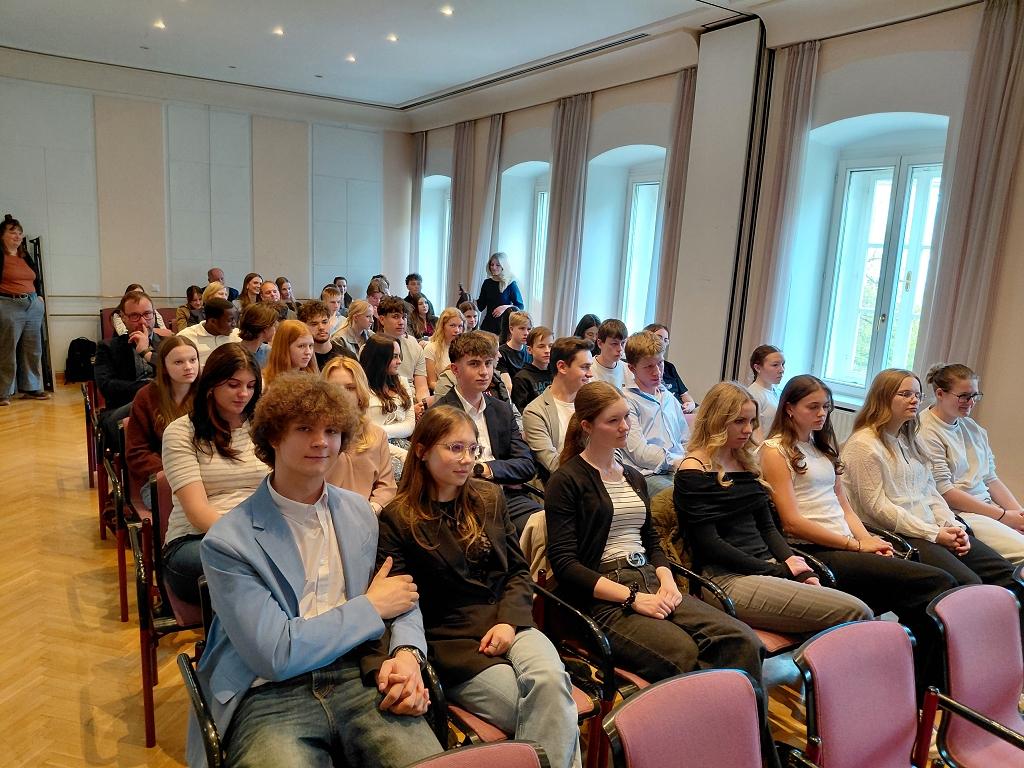 Diese Gelegenheit ließen sich unsere Junior- und Seniorbotschafterinnen und -botschafter nicht entgehen und reisten gemeinsam mit weiteren politisch interessierten Oberstufenschülerinnen und -schülern in die Landeshauptstadt. Nach der Begrüßung durch die Vizepräsidentin des Europahauses, Ana Blatnik, die ihre Freude über das rege Interesse der Jugendlichen an der Europäischen Union zum Ausdruck brachte, referierte Dr. Magnus Brunner über seine Tätigkeit als EU-Kommissar.