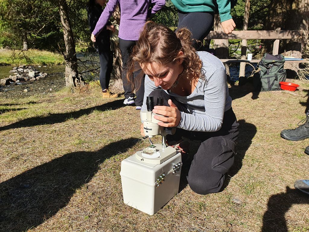 Auf dem Rückweg wurde an einem Bach noch die Mikrofauna unter die Lupe genommen. Dabei wurde nach kleinen Lebewesen (z.B. Larven der Eintagsfliege, Kriebelmücken, Köcherfliegen, …) gesucht, die dann im Mikroskop untersucht werden konnten.