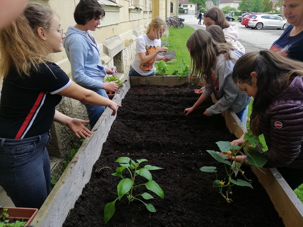 Hochmotiviert gingen die Schülerinnen und Schüler der 1a, 2a, 2b und 3a Klasse ans Werk. Die Kraft erfordernde Arbeit des Umstechens übernahmen die Burschen der 4a Klasse. Gepflanzt wurden u.a. Radieschen, Karotten, Zuckererbsen, Mini-Gurken, Paprika, Schnittlauch, Kresse und natürlich Erdbeeren.
